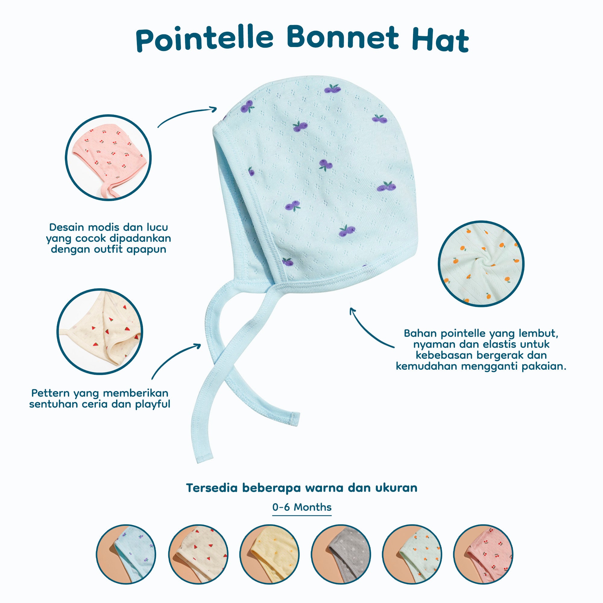 Dengan kemampuan menyerap keringat yang baik, Baby Bonnet Hat berbahan Pointelle ini membuat si kecil akan tetap merasa segar dan kering. Kainnya yang lembut dan lentur membuatnya nyaman dipakai untuk aktivitas sehari-hari.