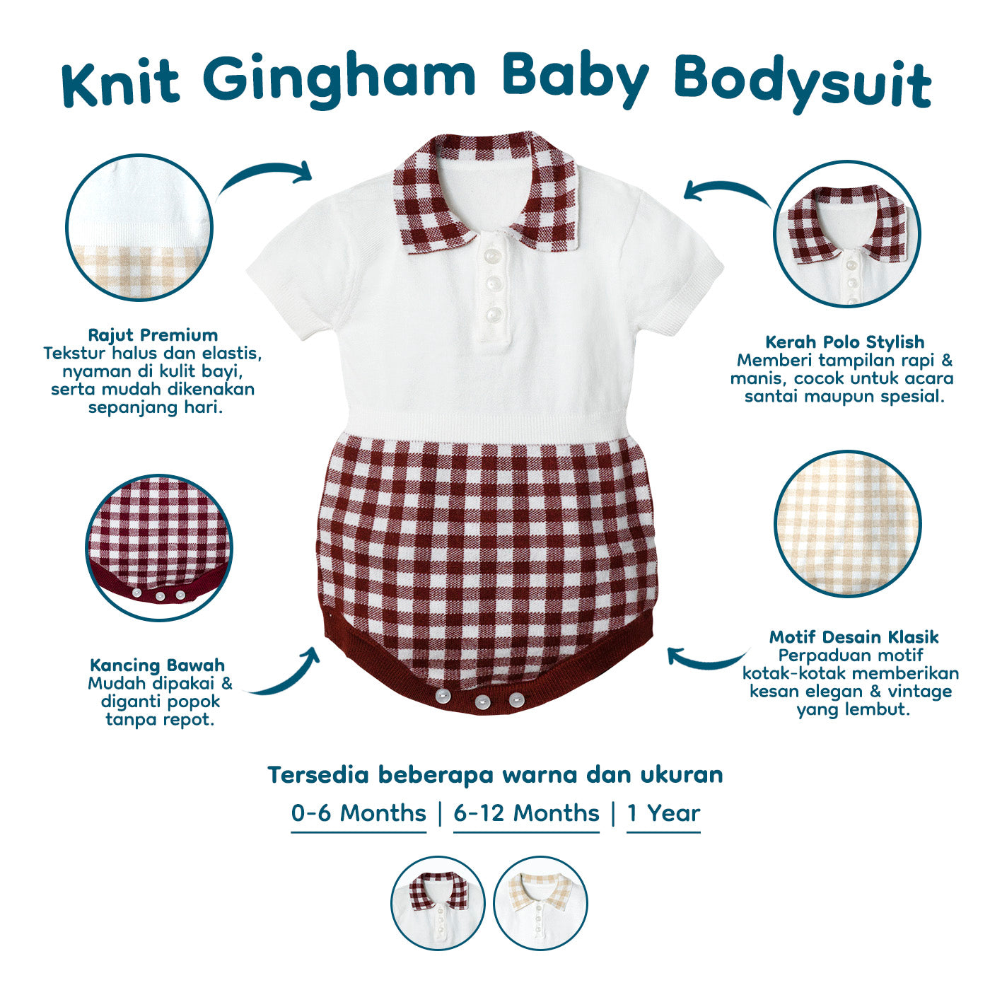 Gingham Knit Bodysuit ini terbuat dari rajutan lembut berkualitas memberikan kenyamanan ekstra untuk kulit sensitif si kecil. Bahannya stretchy, breathable, dan hangat pas di badan, cocok untuk dikenakan sehari-hari maupun acara spesial.