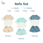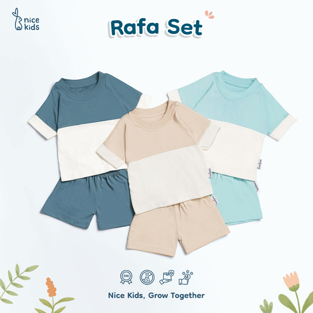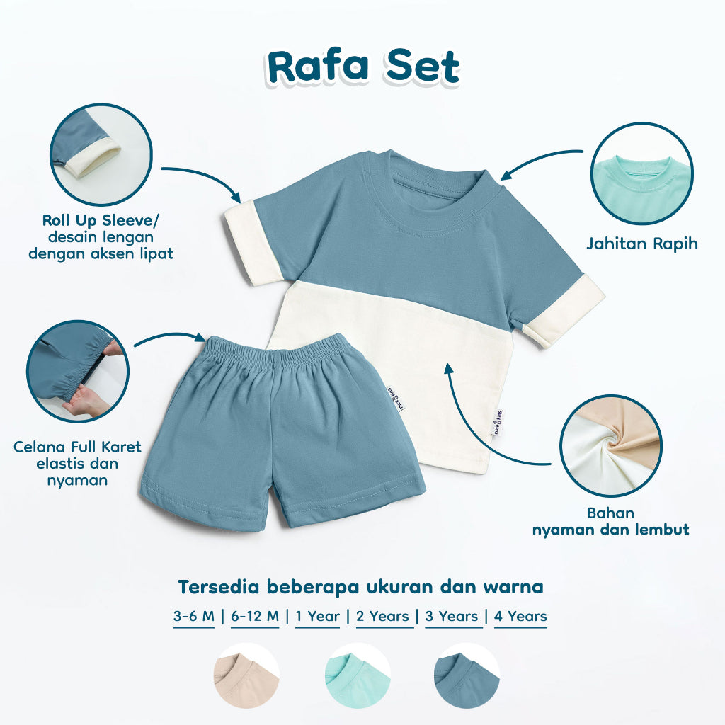 Setelan Rafa set Baju Anak ini terbuat dari bahan katun pilihan dan yang pasti terbaik untuk sang buah hati.