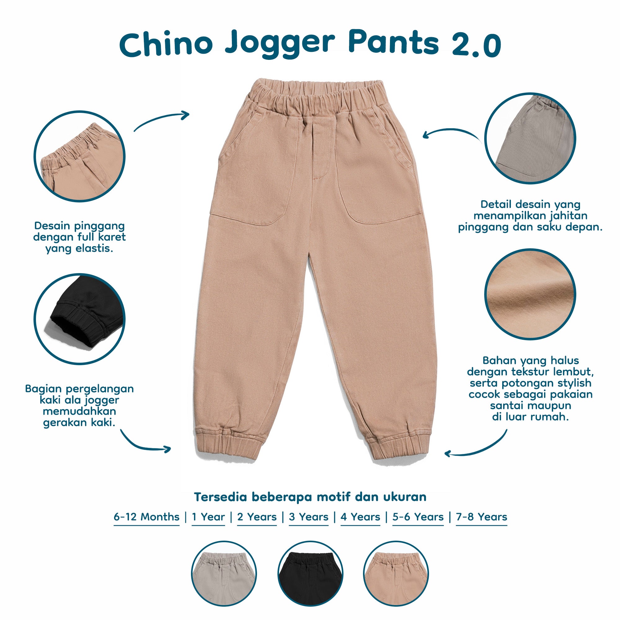 Chinos Jogger ini terbuat dari bahan chino pilihan dan yang pasti terbaik untuk sang buah hati. Dengan bahan yang PREMIUM tentunya akan lebih TEBAL dan tidak kaku. Jangan khawatir ya Moms, karena bahan yang digunakan juga HYPOALLERGENIC (tidak membuat alergi atau tidak mengandung bahan kimia berbahaya) sehingga sangat aman untuk sang buah hati. Kami pastikan Chinos Jogger ini memberikan kenyamanan pada sang buah hati Mommy untuk sehari-hari.