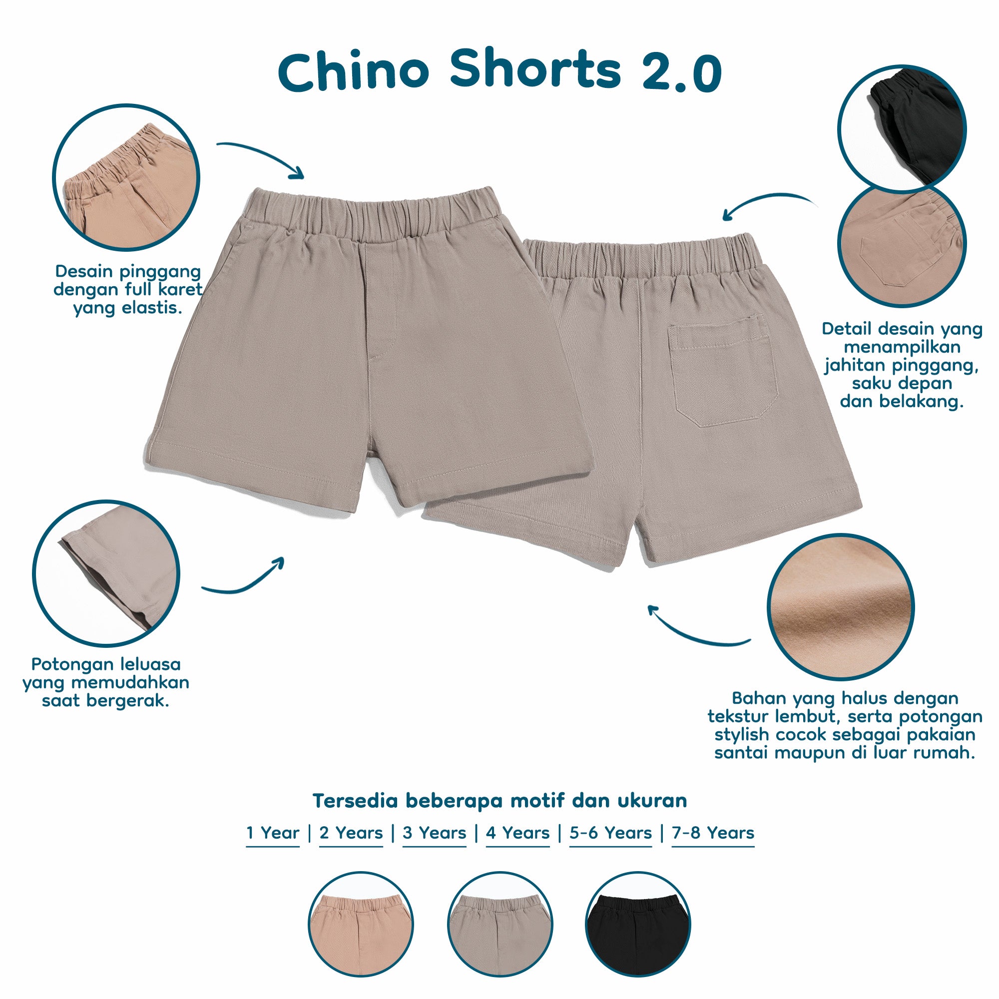 Chinos Short ini terbuat dari bahan chino pilihan dan yang pasti terbaik untuk sang buah hati. Dengan bahan yang PREMIUM tentunya akan lebih TEBAL dan tidak kaku. Jangan khawatir ya Moms, karena bahan yang digunakan juga HYPOALLERGENIC (tidak membuat alergi atau tidak mengandung bahan kimia berbahaya) sehingga sangat aman untuk sang buah hati. Kami pastikan Chinos Short ini memberikan kenyamanan pada sang buah hati Mommy untuk sehari-hari.