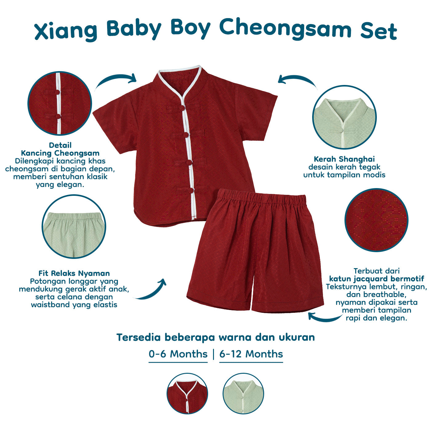 Xiang Baby Boy Cheongsam Set adalah setelan busana tradisional oriental dengan sentuhan klasik. Setelan ini memadukan desain cheongsam yang elegan dengan potongan modern agar tetap nyaman dipakai bayi di momen spesial bersama keluarga.