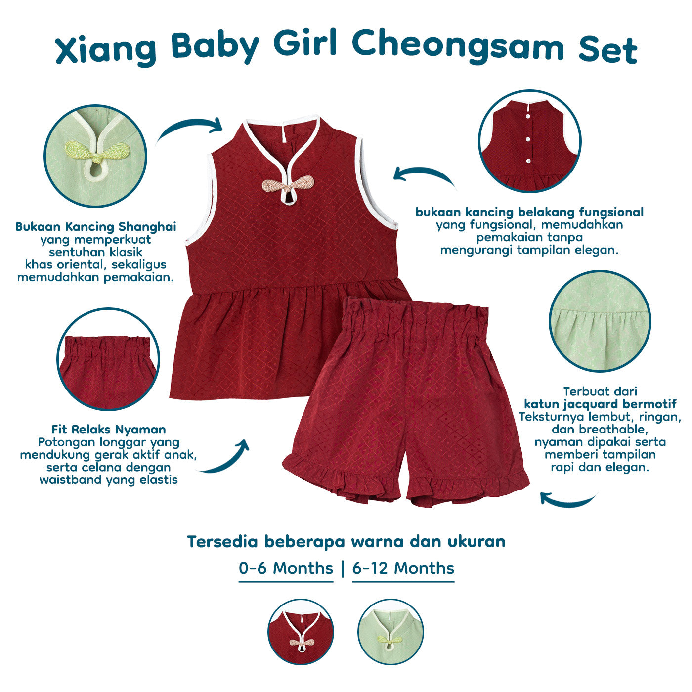 Xiang Baby Girl Cheongsam Set adalah setelan busana tradisional oriental dengan sentuhan klasik.. Setelan ini memadukan desain cheongsam yang elegan dan manis namun tetap nyaman dipakai bayi di momen spesial bersama keluarga.