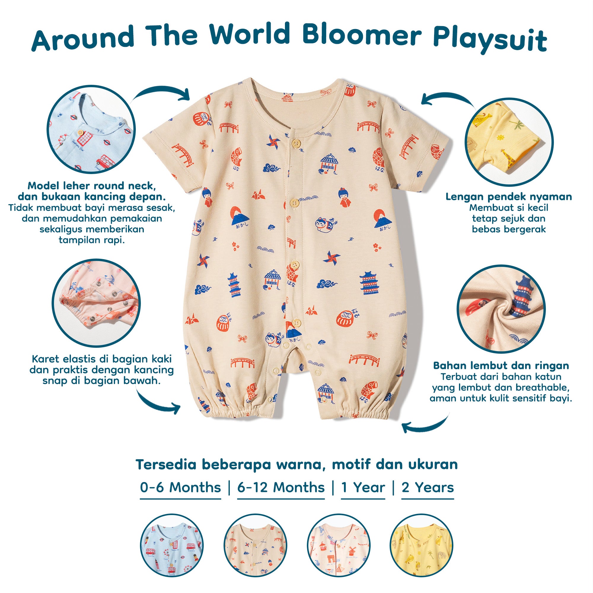 Bloomers Playsuit Around The World adalah playsuit yang didesain manis dengan model bloomers menggelembung sehingga  mampu memberi ruang gerak bebas untuk anak aktif . Playsuit ini pas banget untuk momen si kecil ketika bermain atau jalan-jalan santai.