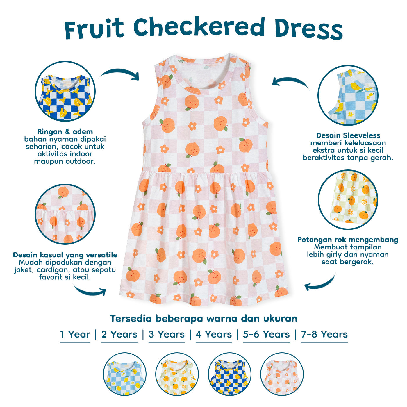 Kami pastikan dengan Fruit Checkered Dress ini bisa membuat si kecil tampil menggemaskan yang siap mencuri perhatian disegala aktivitasnya!