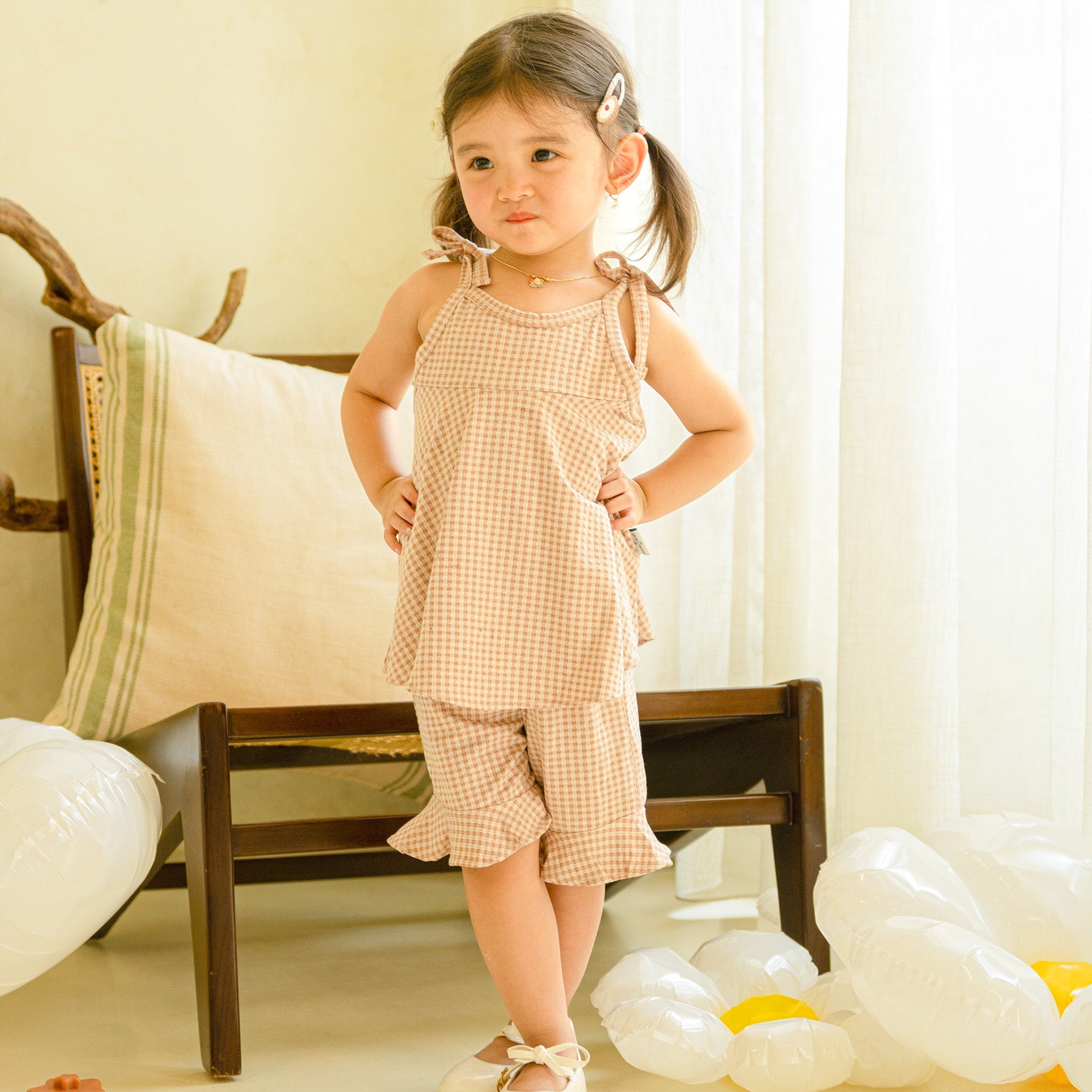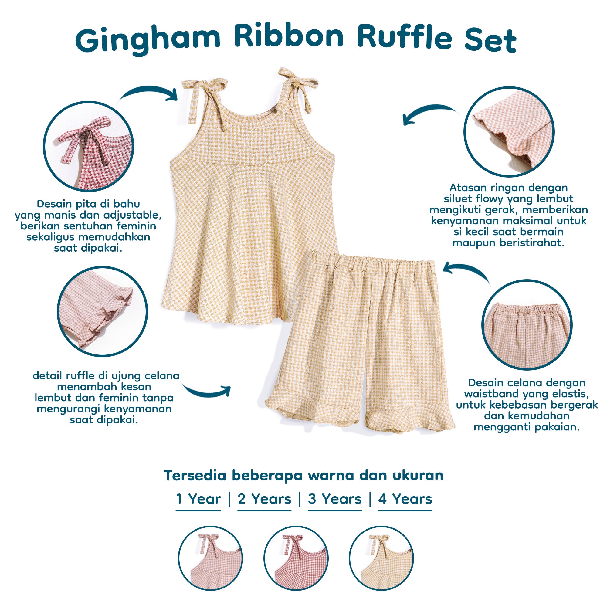 Gingham Ribbon Set ini terbuat dari pilihan dan yang pasti tidak kalah baik untuk sang buah hati. Kami pastikan Ribbon Ruffle Set ini memberikan kenyamanan di segala musim. Setelan baju anak perempuan ini hadir dengan desain motif kotak-kotak (gingham) yang timeless, lengkap dengan detail pita yang menggemaskan. Cocok dipakai untuk jalan-jalan, acara keluarga, atau bermain bersama teman.